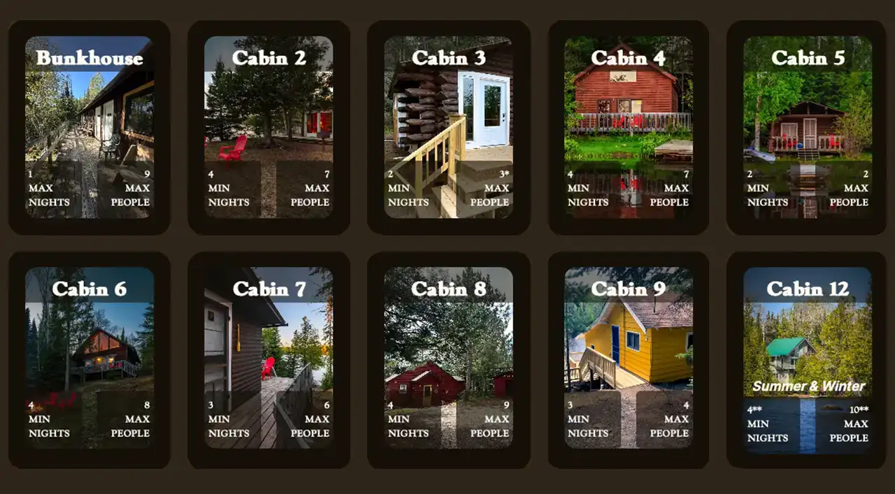 *Cabin 3’s second bed is very small — **Cabin 12 Winter max people is 6 with 2 min nights